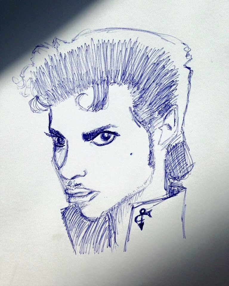 Did this late last year at a Starbucks. The dark areas were the shadows from the blinds, and after I got tired of trying to not get any shadows I worked it so that the shadows helped the overall image. Genius, legend, bad-ass. So long Prince, thank you for the amazing music