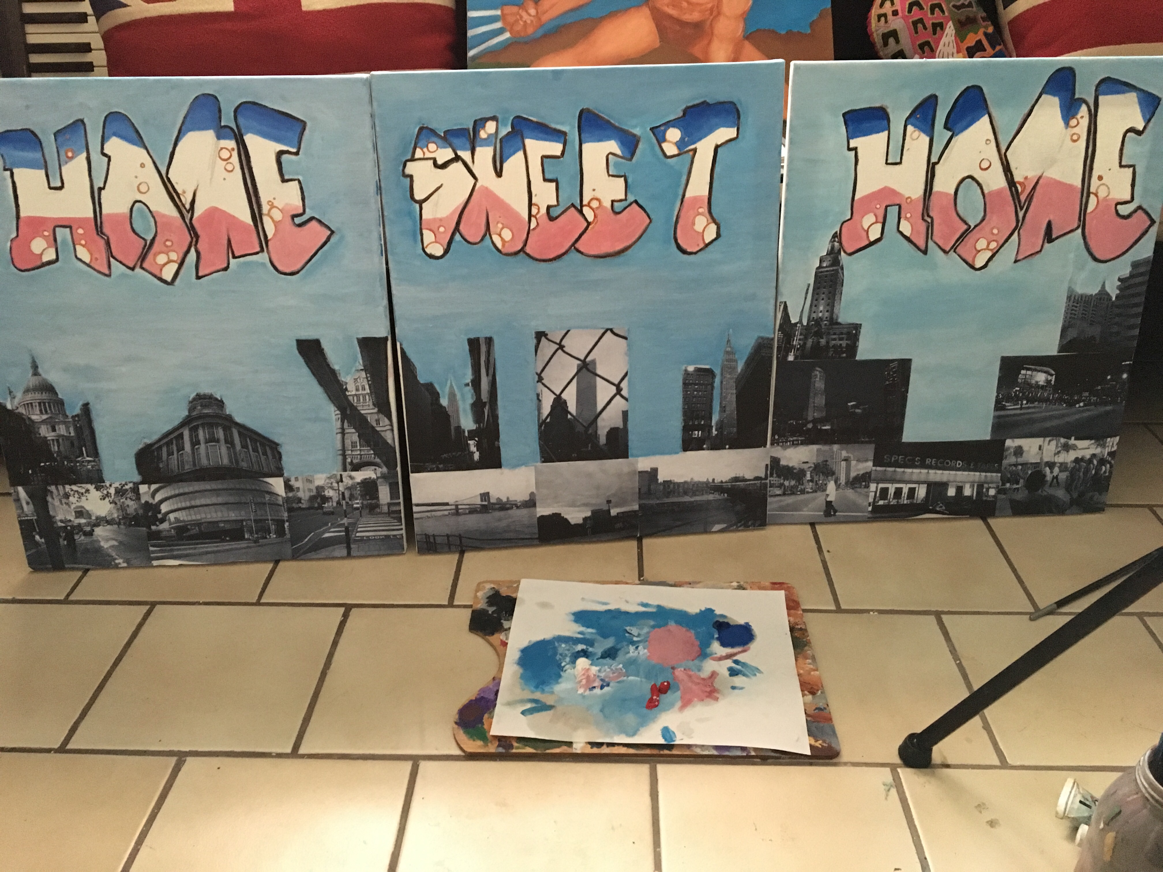 The coloring has begun on the letters of my graffiti/collage/triptych. First was pink, second color I’ve added is blue. I’m thinking maybe white and a light grey for the bubbles. Definitely will add highlights to them once it’s all done. And all I’ll have to worry about is adding clouds and then I’ll be done. Hopefully. Maybe. Lol.