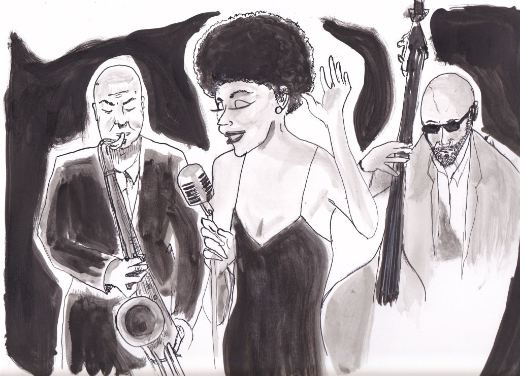 I was in a jazzy mood yesterday, and made this piece. Jazz trio, pen and ink, ink wash on Bristol. 9×12 For purchase on my Ko-fi page, on the Art for Sale tab. Thank you and please enjoy.