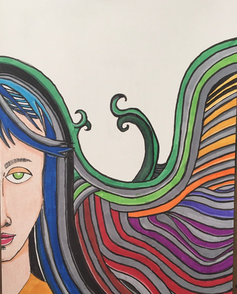 Stella/Lewitt wavy hair, 9×12. #artbynuwaver74 #sollewitt #frankstella #abstractartwork #coloreddrawing #kofiartist #artforsalebyartist #prismacolormarkers #coloredhair #artprocess #makearteveryday